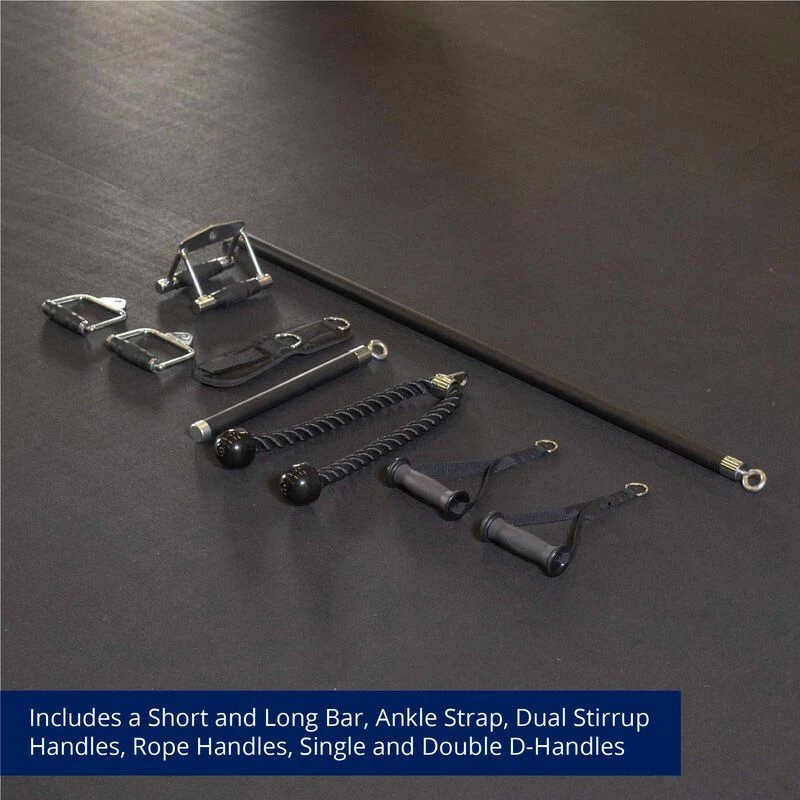 The Functional Trainer is a strength trainer designed to breathe new life into your fitness routine. This all-in-one training system is built from high-grade steel to help you power through your workouts and attain your fitness goals. With 200-pound fully enclosed dual weight stacks, you can efficiently perform pulldowns, flies, squats, lunges, twists, and more. It comes with a Short Bar, Long Bar, Ankle Strap, Dual Stirrup Handles, Rope Handles, Single and Double D-Handles so you can move from one exercise to the next quickly and maximize your workout. Freely adjust the pulley position higher or lower across their square poles to add horizontal force to your regular exercises such as lunges, squats, and step-ups – increasing your gains and adding new dynamics to your home gym. The Functional Trainer is built for long-lasting use, ensuring its durable steel construction will stay strong through even the most intensive exercises. The black and silver design looks sleek in every setting and will compliment your home or garage gym. This machine is the ultimate answer to your workout plateau and will rock your fitness routine to the next level.