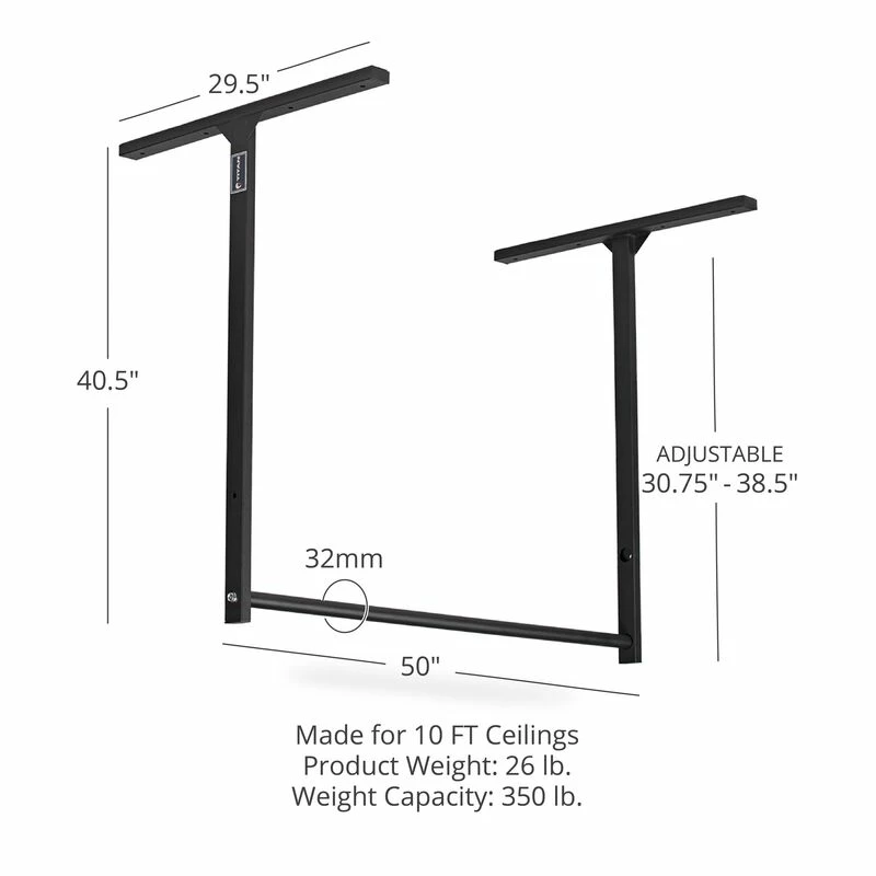 The Large Pull-Up Bar is designed as an adjustable stud-mounted 10 FT max ceiling mount or wall mount. Crafted from 14-gauge steel with the pull-up bar slots measuring at either 31-inches or 39-inches from the mounting point, so you can easily adjust the chin-up/pull-up bar to the appropriate height for your needs. Perform exercises to strengthen your back, upper body, and lateral muscles. Rated at a 350-pound weight capacity, this durable wall-mounted pull-up bar is a great strength accessory to add to an existing gym or instantly turn a room into one.