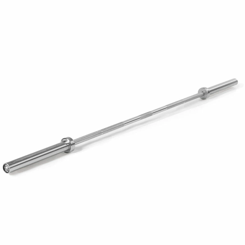 The MAXXUM Stainless Steel Power Bar is marked for the experienced powerlifter. This 20 KG bar, crafted with a 28 mm shaft, supports a weight capacity of up to 2,000-pounds, making for some serious gains. The bar is fully constructed from precision-grade stainless steel with the shaft providing a tensile strength consistency of 230,000 PSI. The bar features a single powerlifting mark, center knurling, and a deep medium diamond textured knurling on either end. This low-maintenance stainless steel bar is built for garage gym settings. Eliminate the worry of chipping or wearing on the finish with this oxidation-resistant bar.