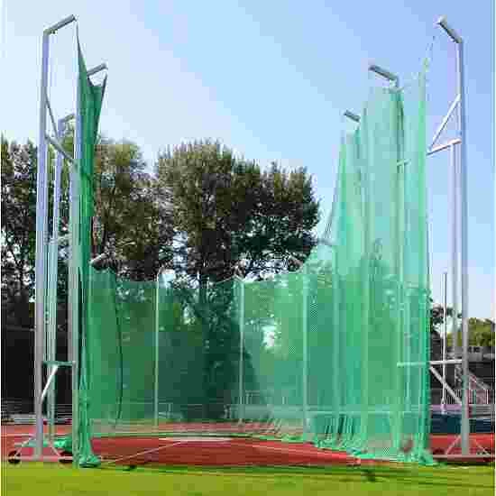This high-quality hammer throw safety net is suitable for all cages height 7 to 10 m. The net height is 7.5, increasing to 10m and is approx. 31.50-m long. The net, made from long-lasting, high-strength polypropylene, is edged with 8-mm-thick border rope on the upper edge as well both vertical edges. The mesh width is approx. 5 mm. 135 kg