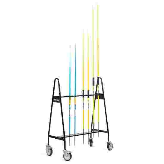For track and field in clubs and schools as well as for athletics stadiums. Can accommodate 30 javelins. Easy to use thanks to sturdy wheels with brakes. Made of steel. LxWxH: 127x56x140 cm. 13.6 kg.