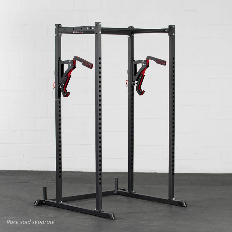 The Adjustable Monolift Attachment is a lift assist compatible with the T-2 Series Power Rack. Crafted with a J-hook style mounting system that allows you to install the attachment to your rack within seconds. Easily clip the mounting system into the uprights by inserting the pin and rotating the lift down. No hardware is required. Designed with counterweight handles at the top, so when you lift a barbell off the lift, the hooks will swing back toward the rack and stay there. This feature clears up space so you can exercise in place without having to walk the bar out from over the J-Hooks. Re-racking is just as easy; a short lean forward re-racks the bar and returns to its original position. Reduce the possibility of injury and go for max reps with a T-2 Series Monolifts!