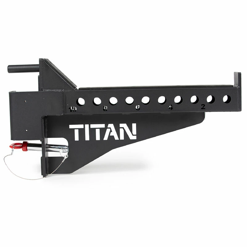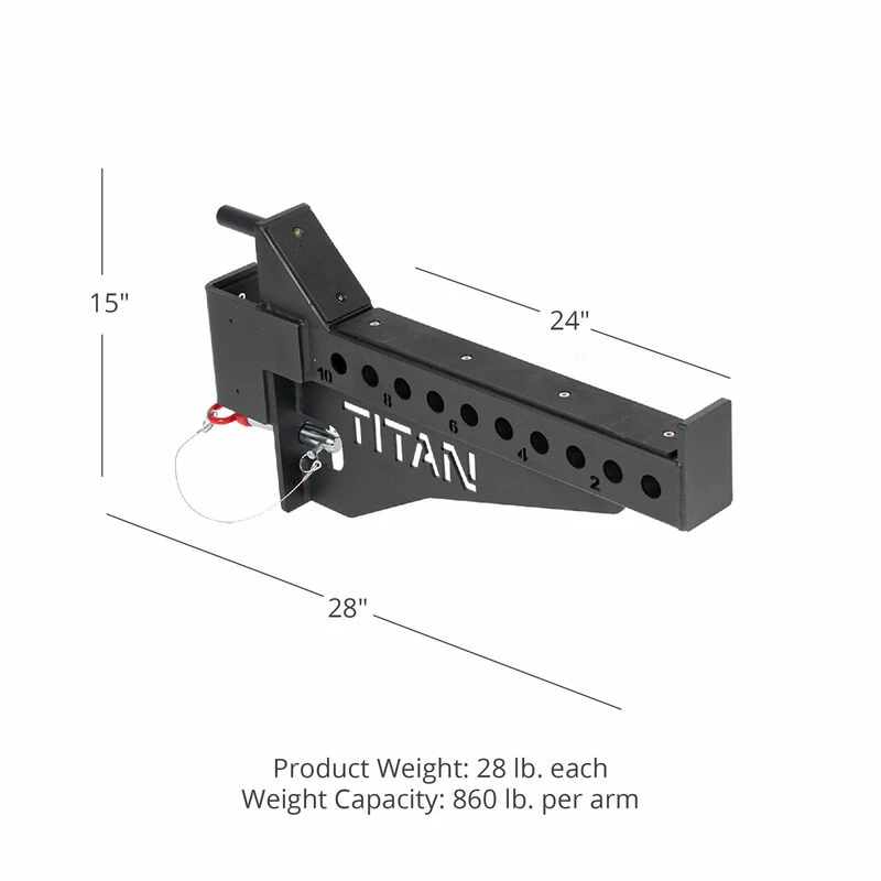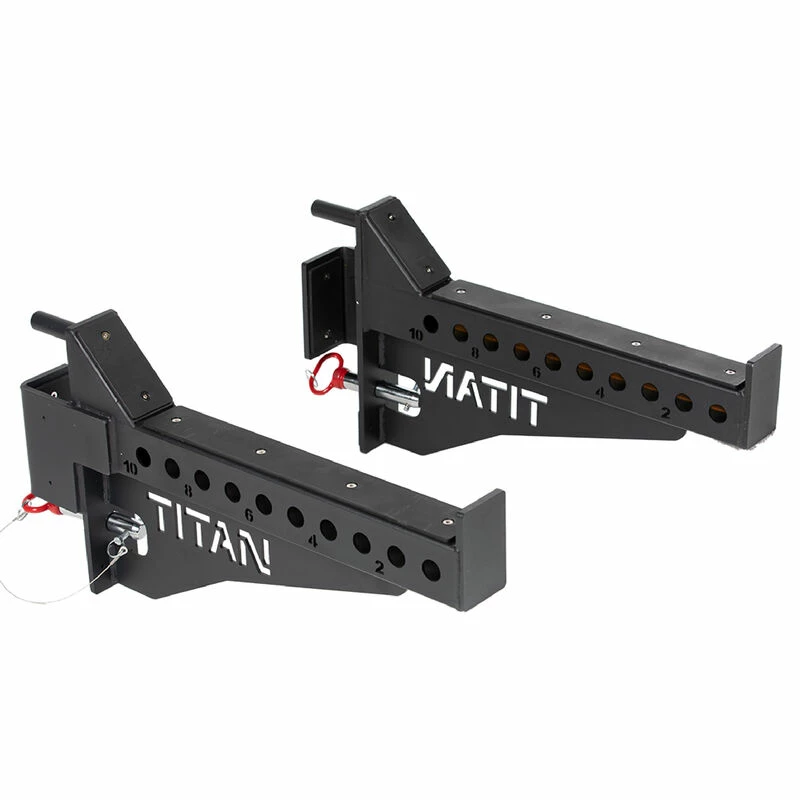 Unleash your inner Titan with the Spotter Arms designed for the TITAN Series Power Racks. Constructed from heavy-duty 11-gauge steel, these barbell catches will hold a weight capacity of up to 1,700-pounds. They are fully lined with durable plastic liners and are powder-coated to protect your safety catches and barbell from damage. The arms easily adjust up and down your TITAN Series Rack with quick pin adaptors. Secure, dependable, and an absolute must-have for anyone who prefers to do hard training alone.