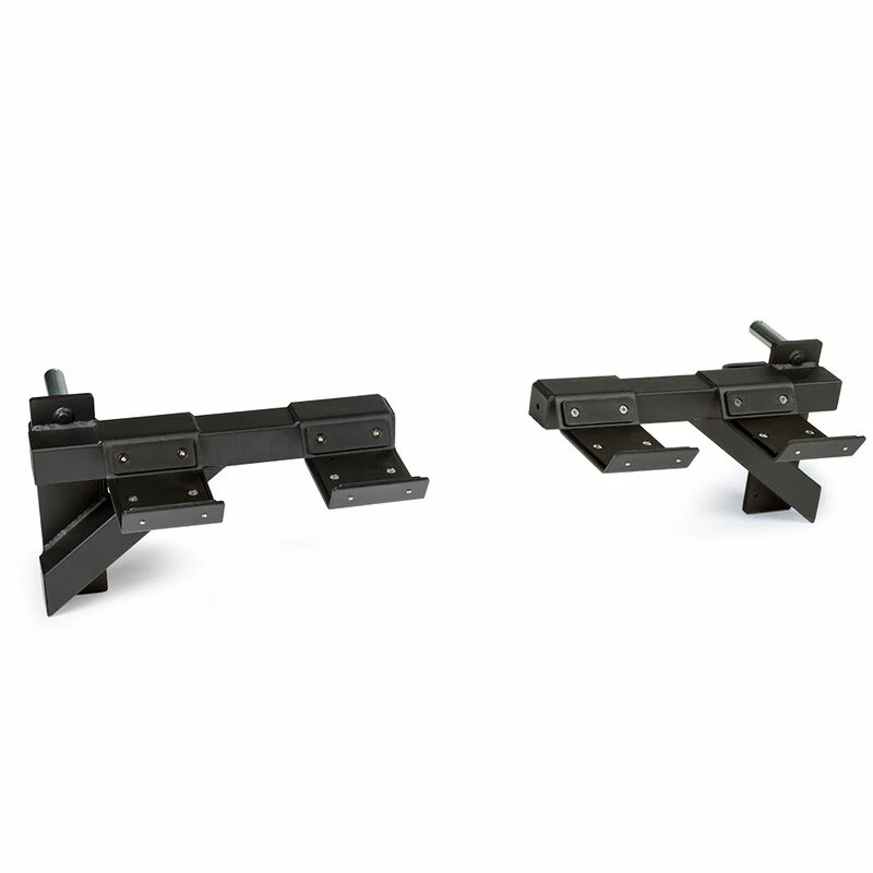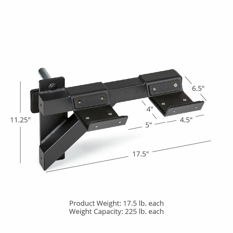 The rack-mounted Dumbbell Weight Bar Holders allow you to place one pair of dumbbells on either side of your X-3 or TITAN Series Uprights in order to conveniently and safely perform free-motion dumbbell lifts. Designed with a J-hook style mounting system that allows you to install the bars to your rack within seconds. Easily clip the mounting system into the uprights by inserting the pin and rotating the holders down. No hardware required. The safety spotters can hold up to a combined 450-pounds and are a great asset when transitioning between sets and exercises. Lock them to your desired height and get to lifting!